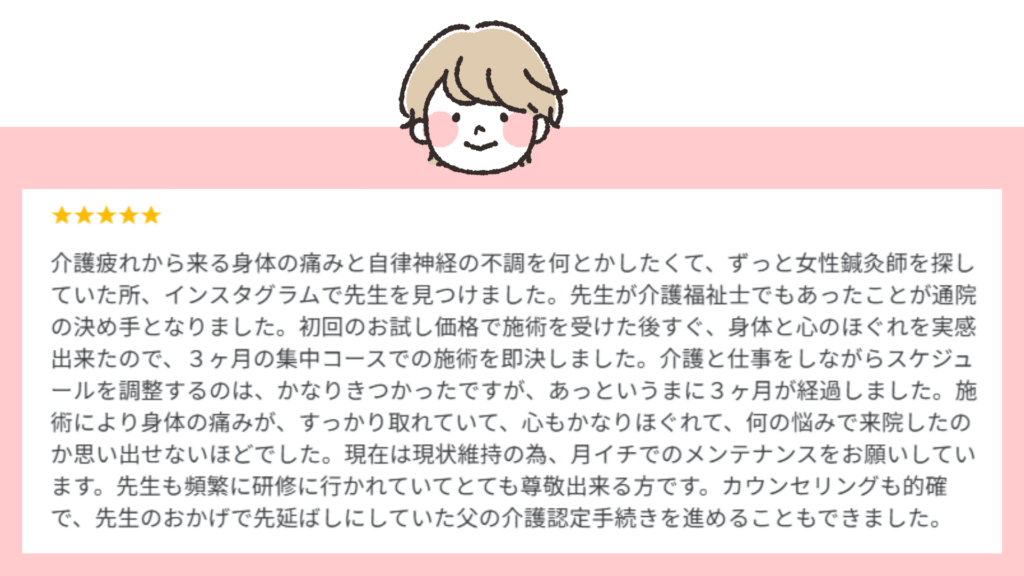 「とにかく鍼とお灸が気持ちよく、この施術なら続けられると思いました。」